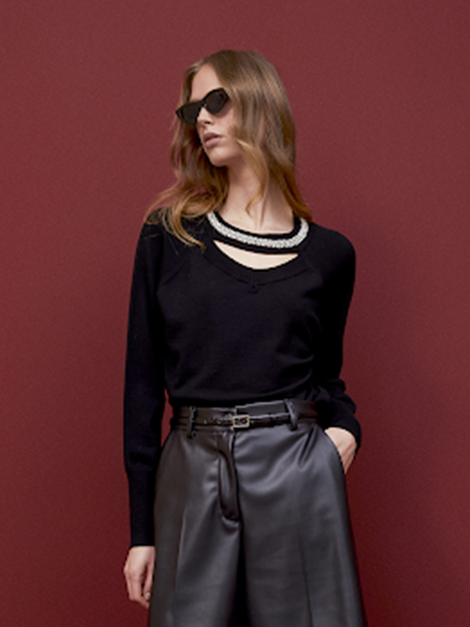 Maglia clips con vestibilita' regolare. Dettaglio di strass con apertura sul collo. Elastico sul fondo e sui polsini.