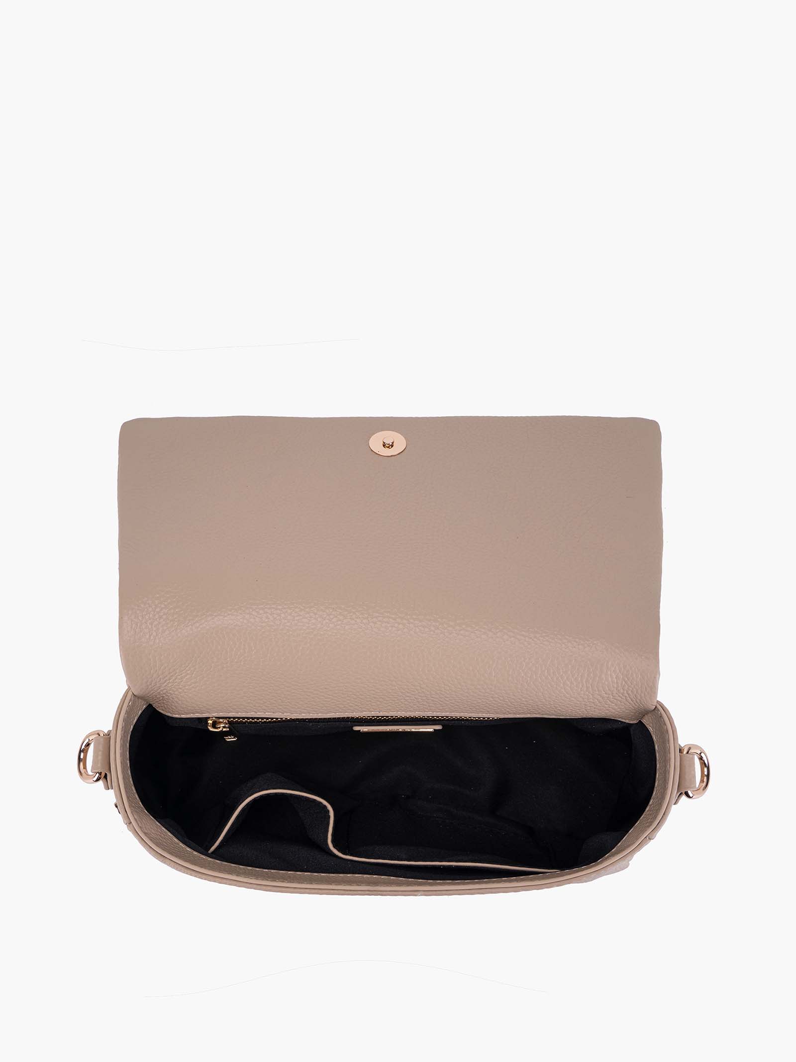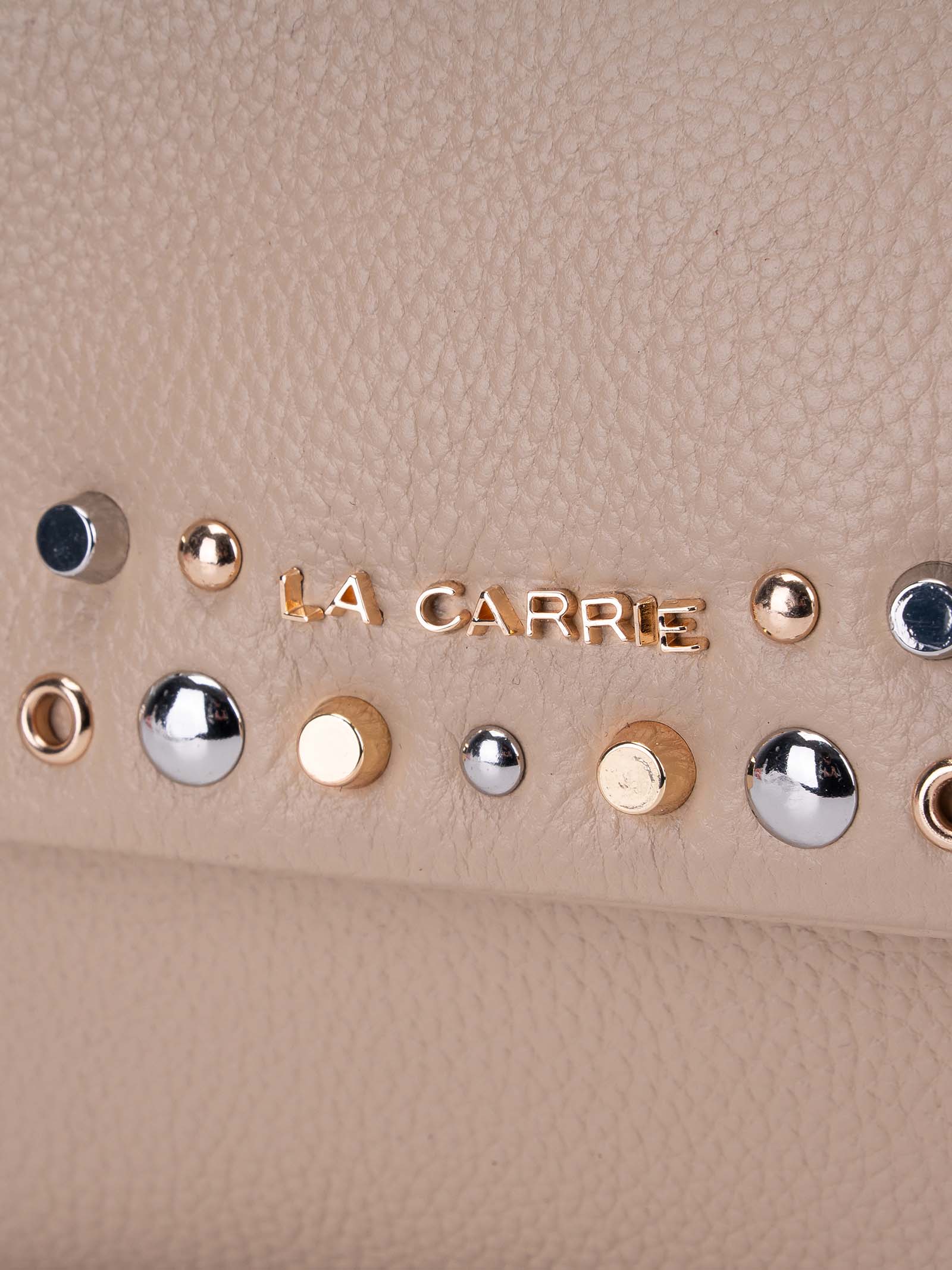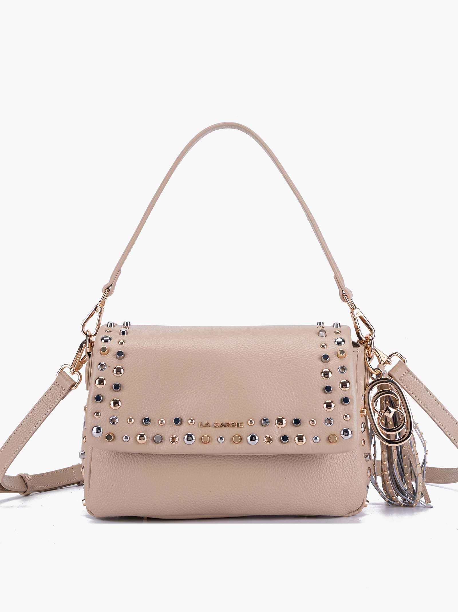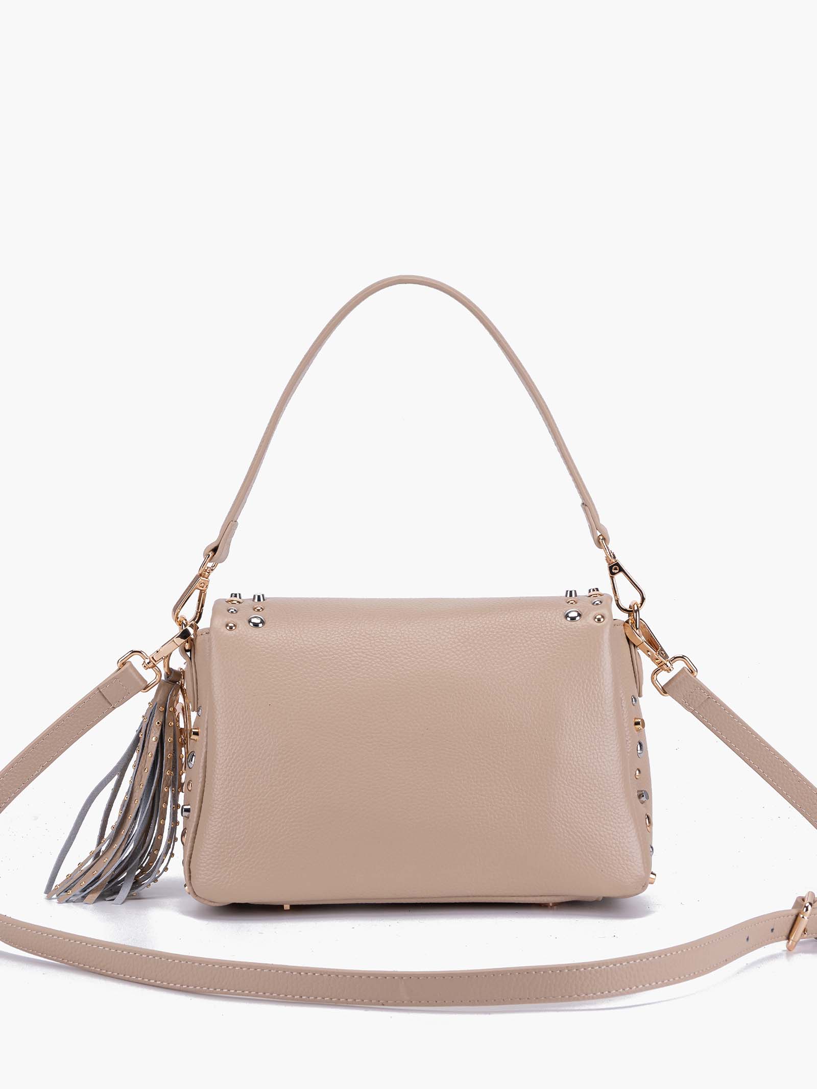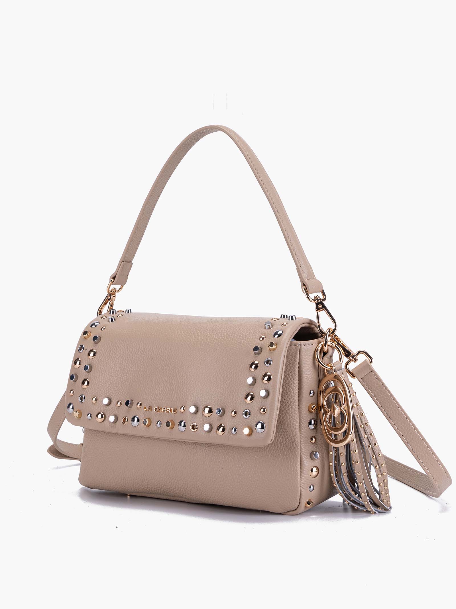 Borsa la carrie a spalla in pelle martellata con borchie in oro ed argento, manico e tracolla in pelle rimovibili