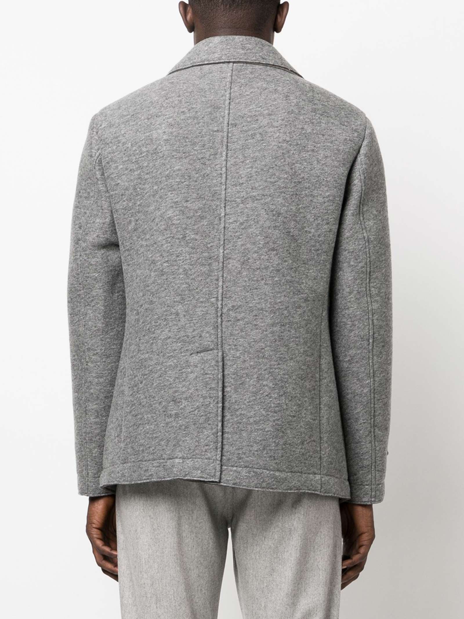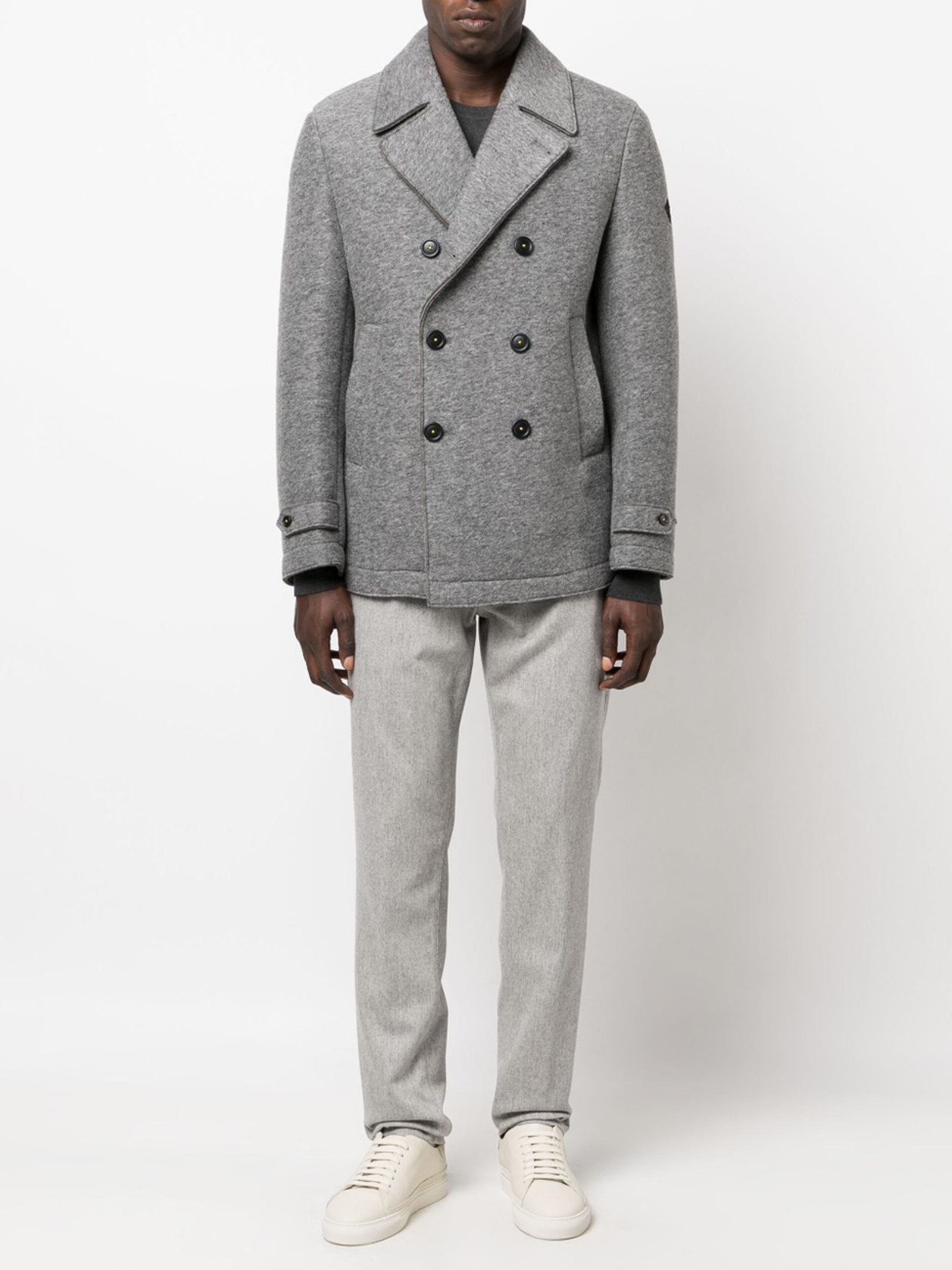 Revers classici, chiusura doppiopetto con bottoni, maniche lunghe, orli con cintura, due tasche laterali a filetto, spacco posteriore e orlo dritto