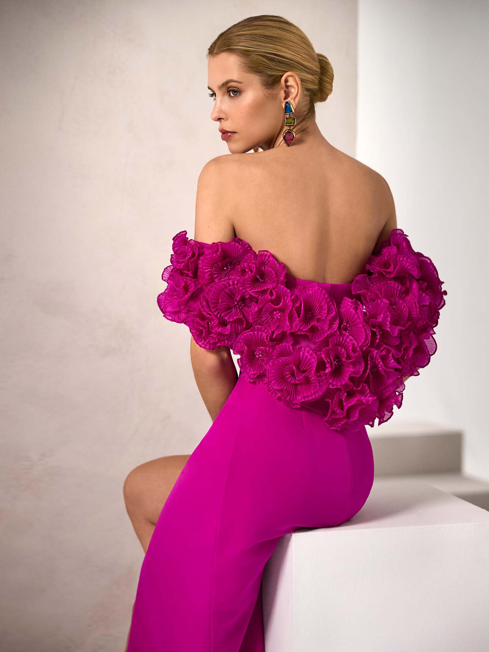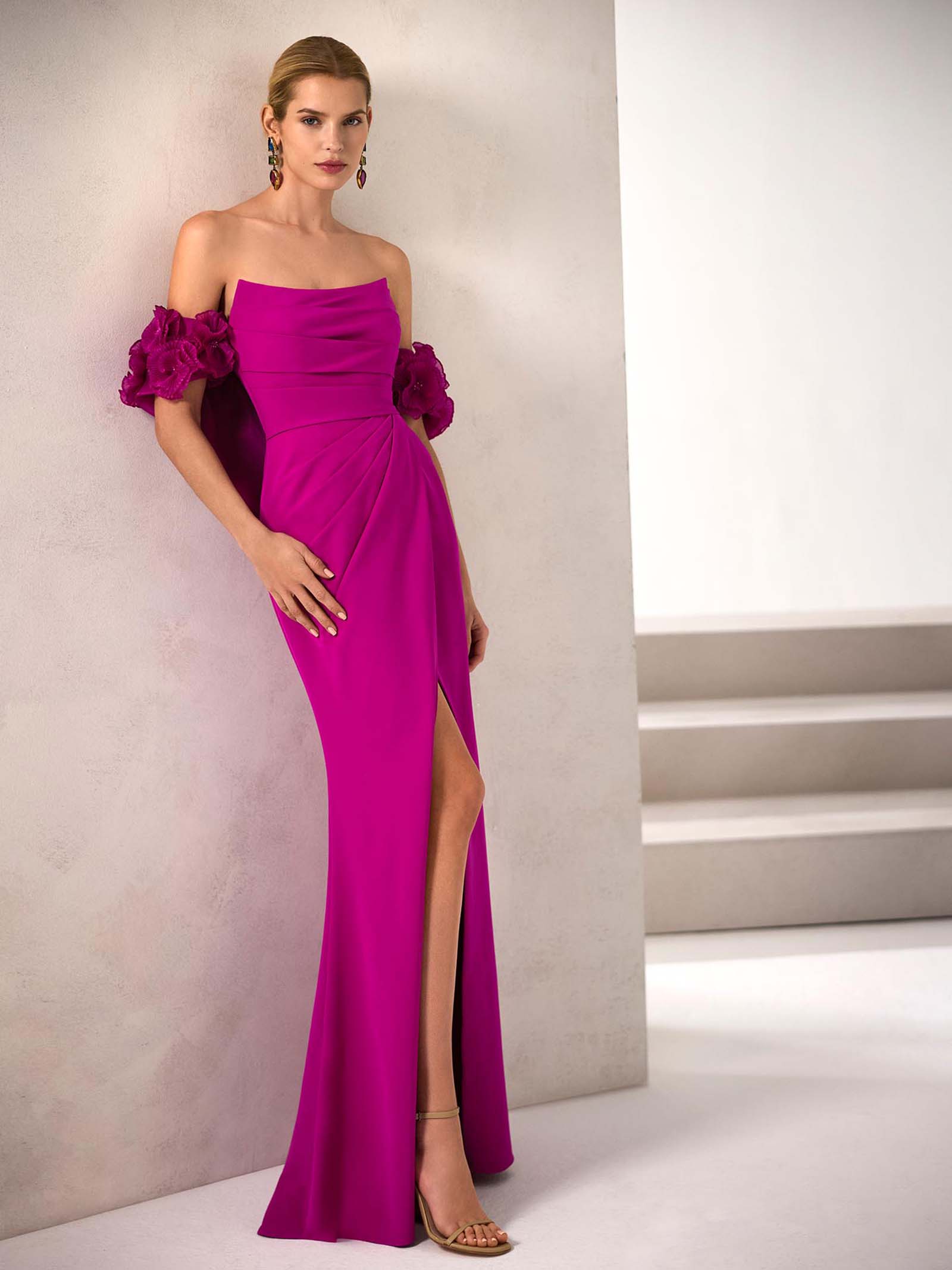 Abito da sera lungo due pezzi. Realizzato in crêpe elasticizzato. Scollo senza spalline. Include giacca.