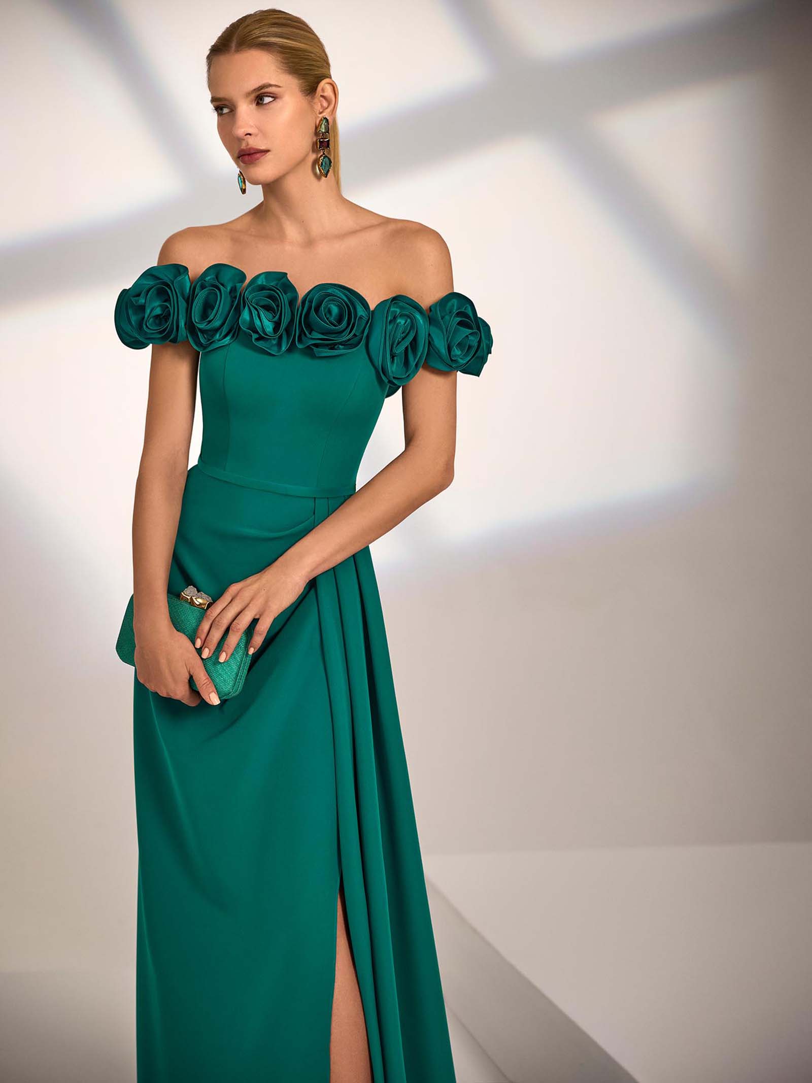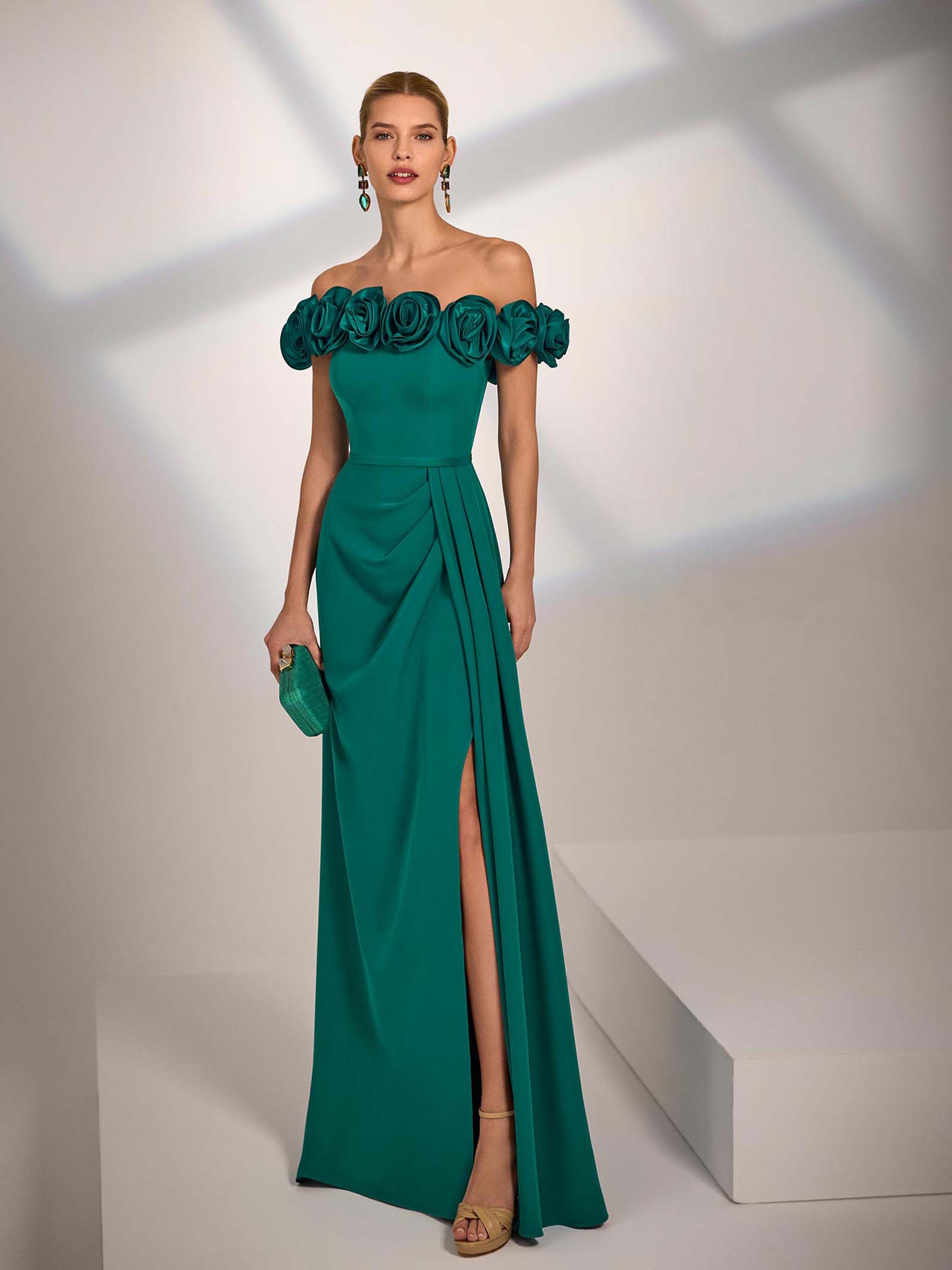 Abito da sera lungo. Realizzato in crêpe elasticizzato. Scollo senza spalline. Dettagli floreali.