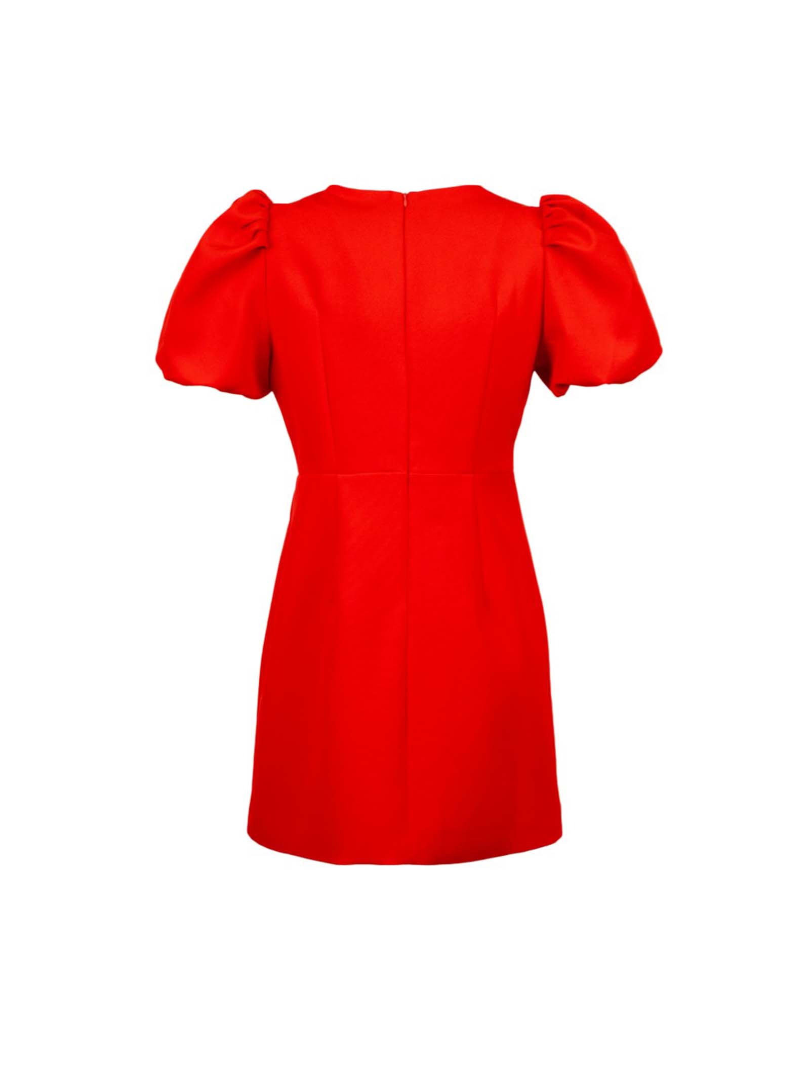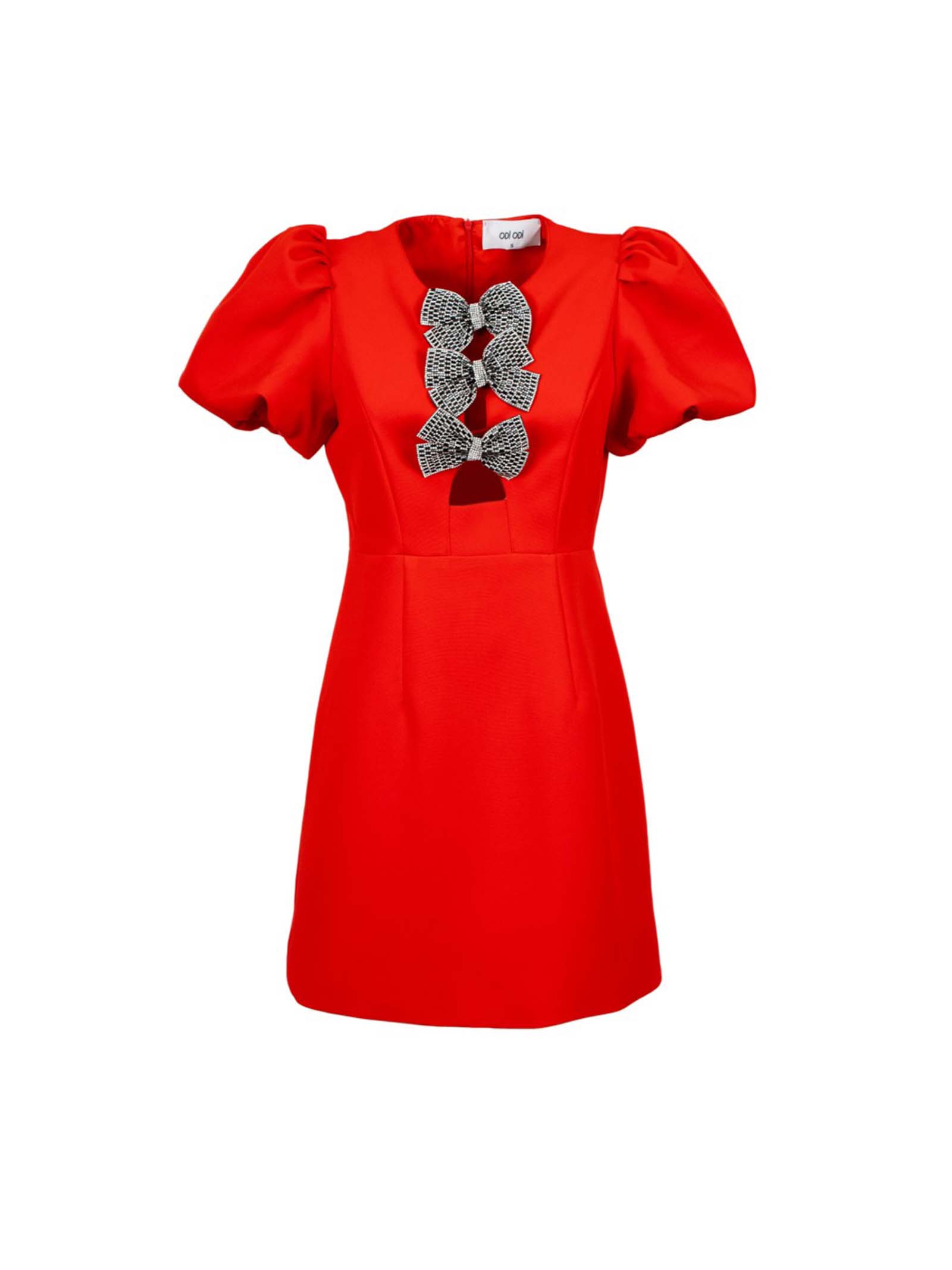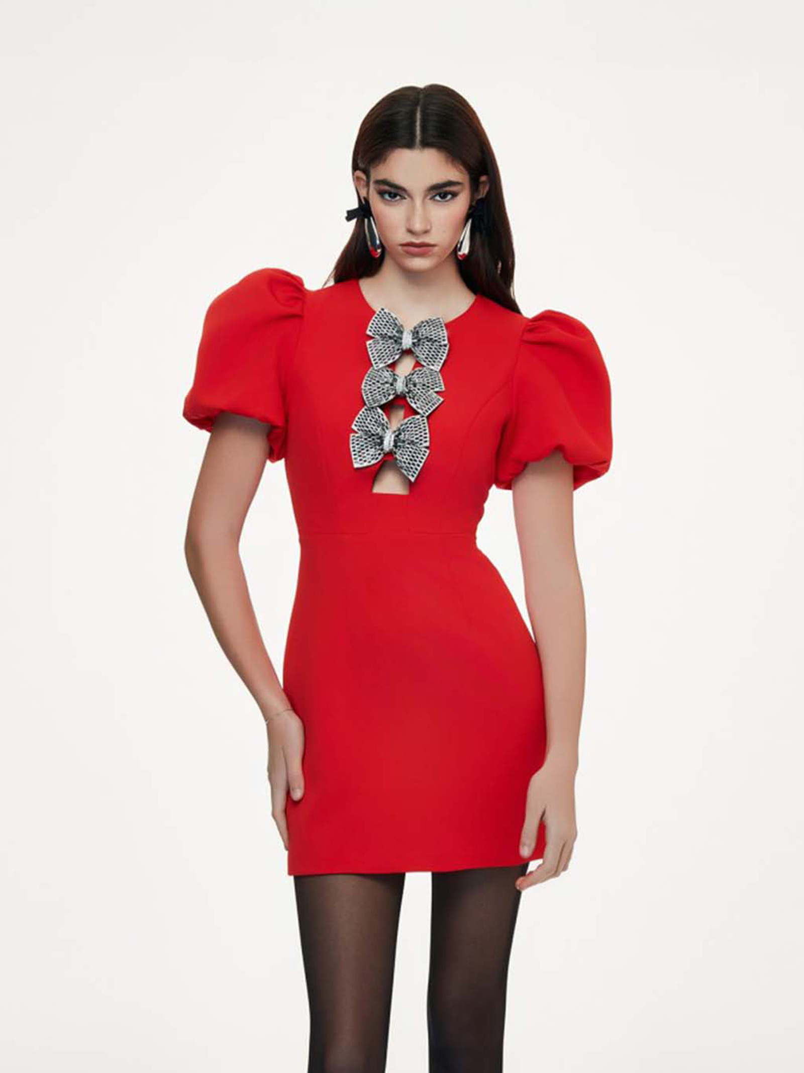Abito odi odi mini con scollo tondo, manica palloncino, fiocchi a contrasto applicati sul fronte.