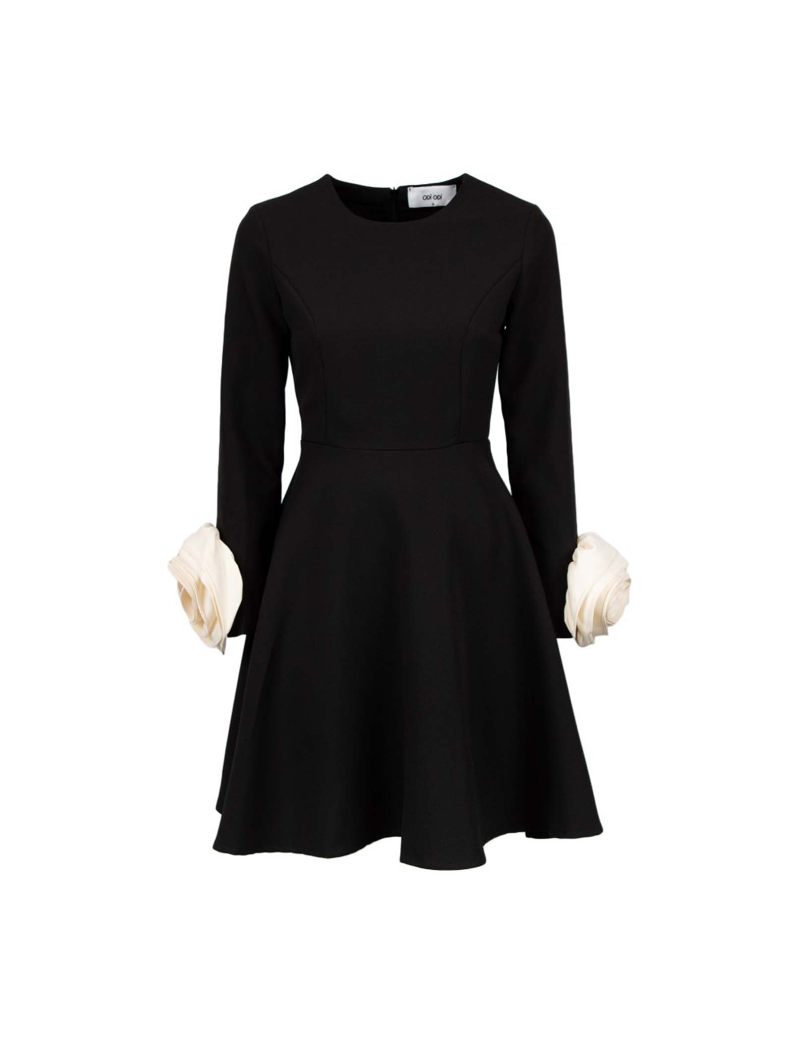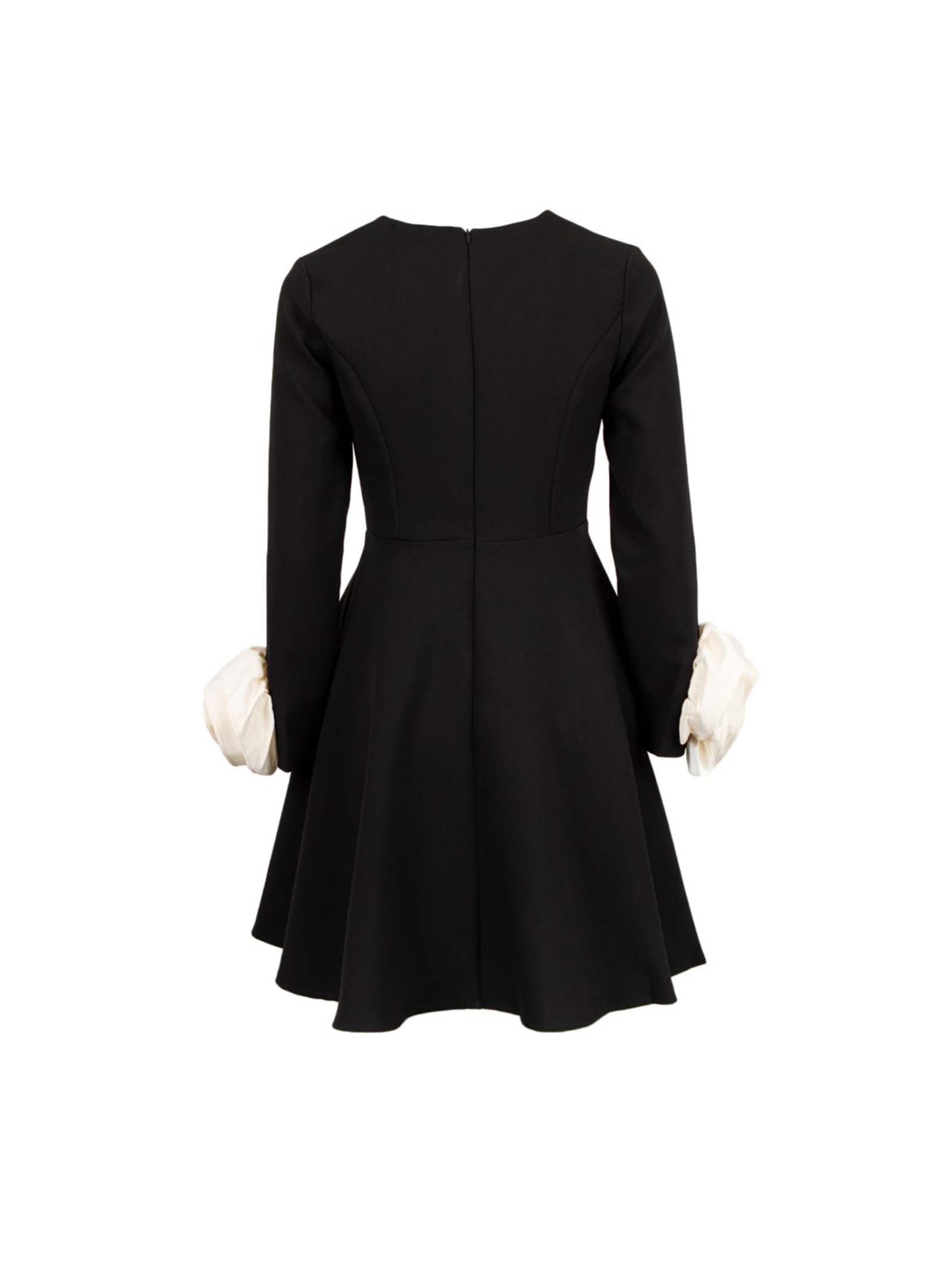 Abito odi odi midi con scollo tondo, gonna svasata, fiori in tessuto a contrasto applicati sulle maniche.