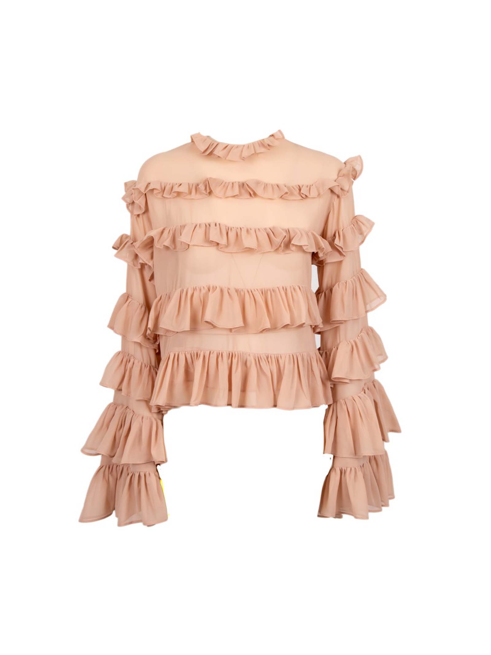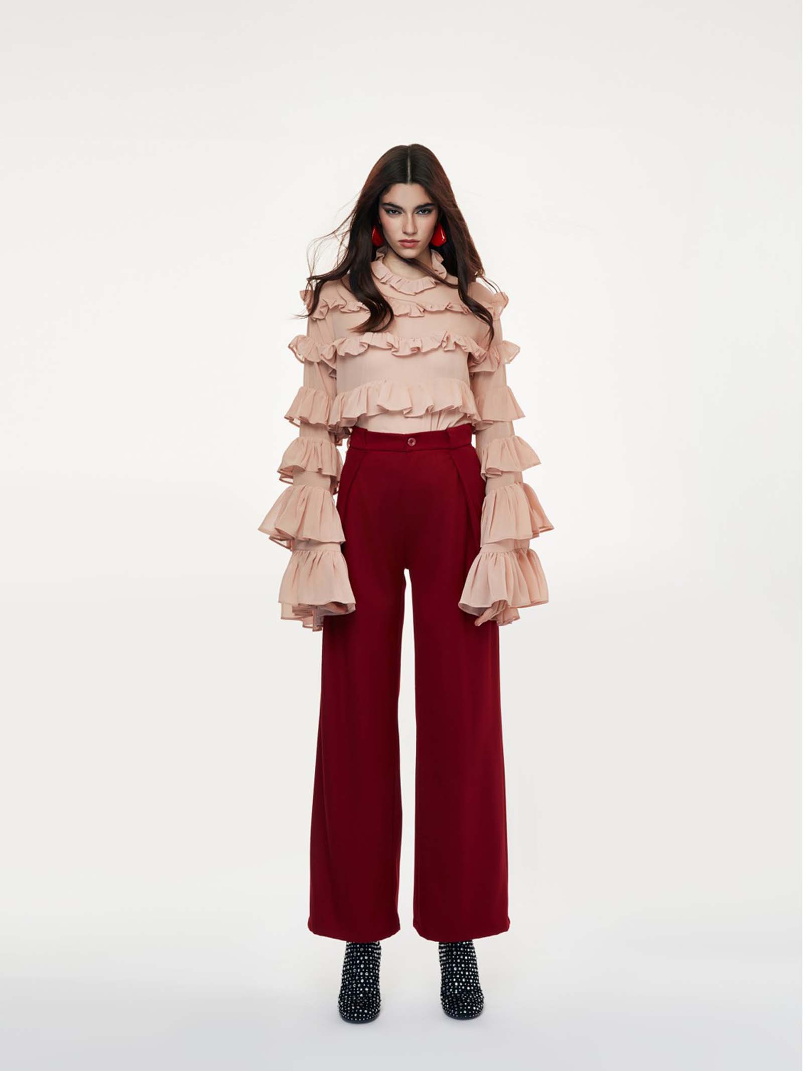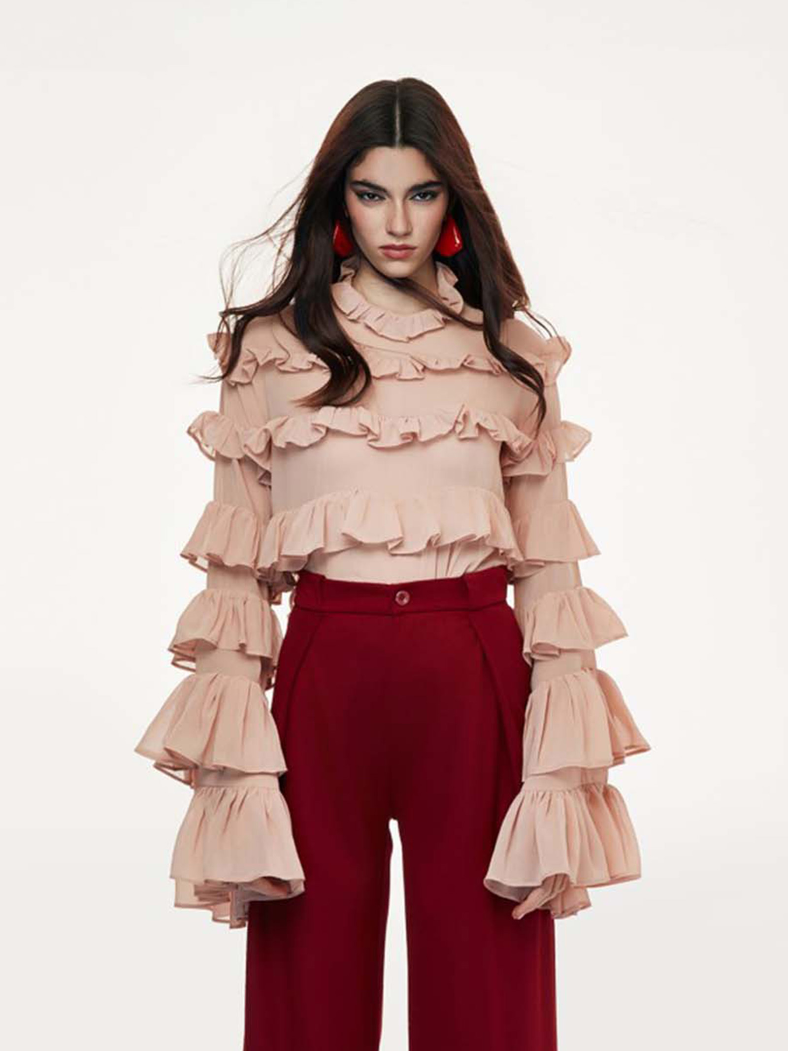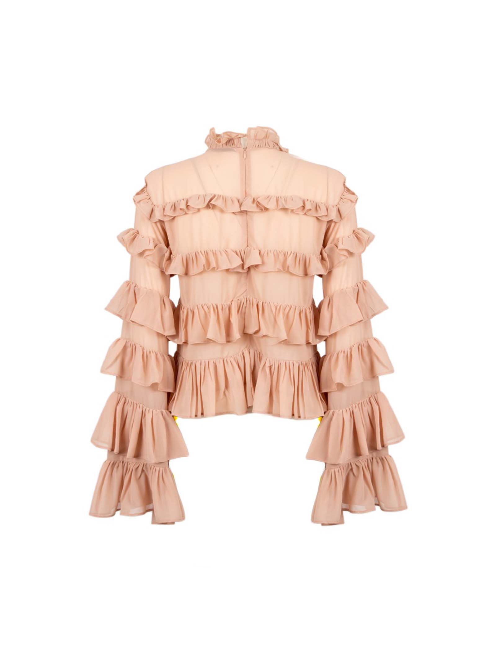 Blusa odi odi collo alto arricciato, a balze con maniche svasate a campana.