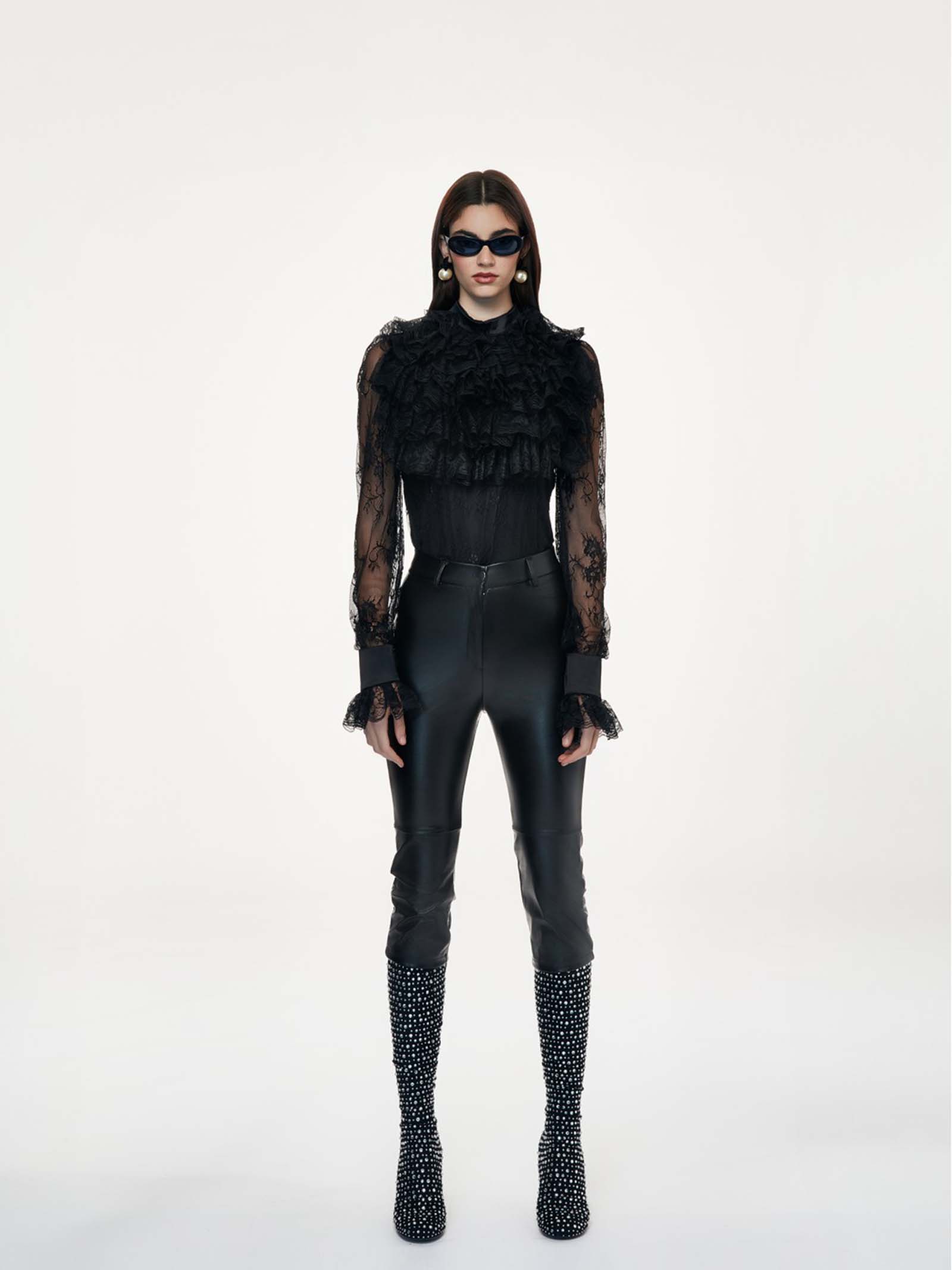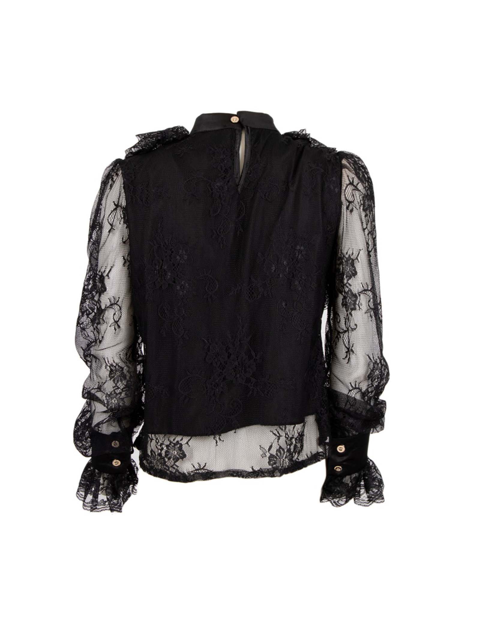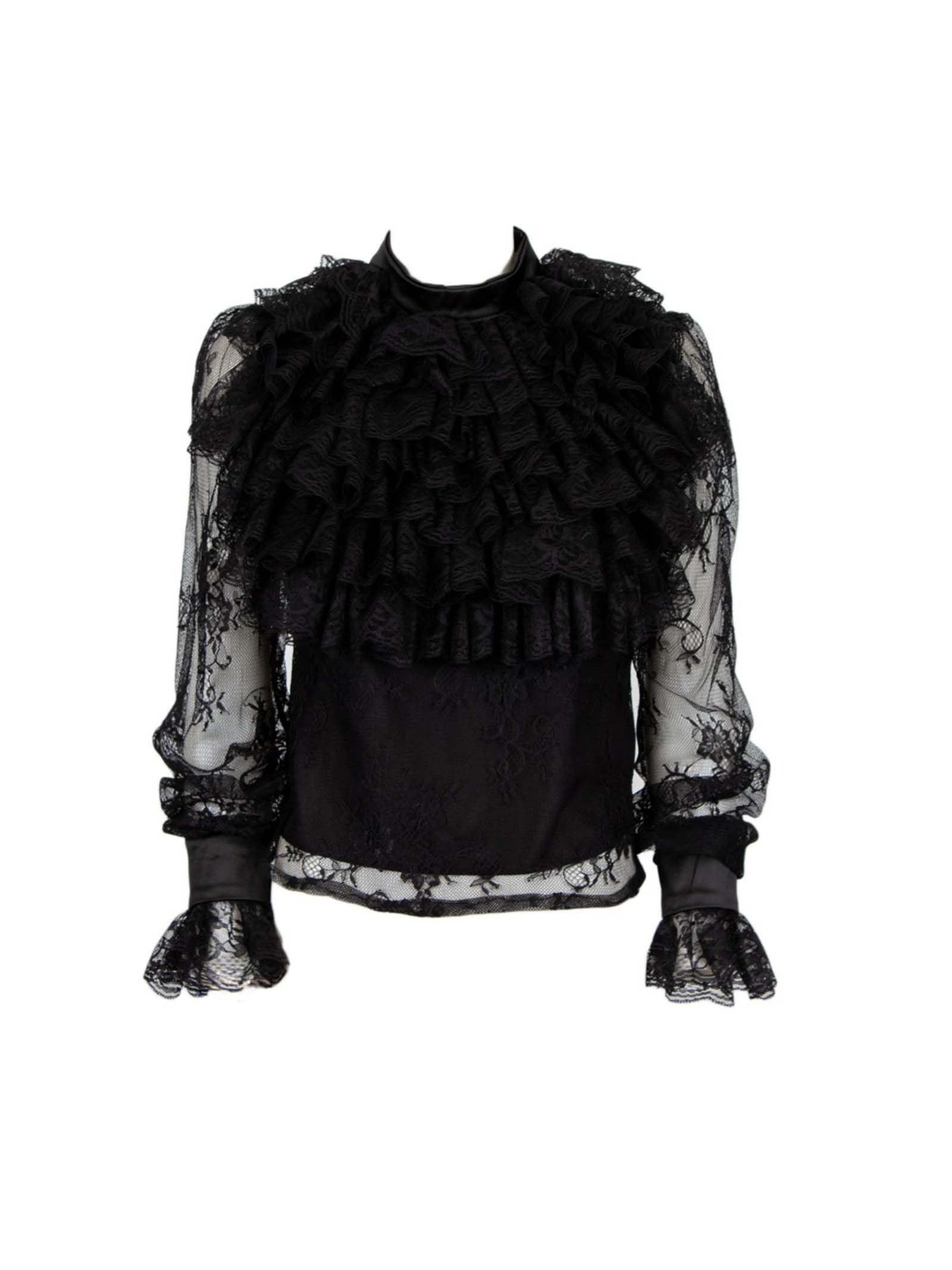 Blusa odi odi strutturata collo alto con ampia rouche di volant a più strati sulla parte superiore, che copre il busto. Maniche lunghe in pizzo trasparente con polsini in raso e volant in pizzo sul fondo.