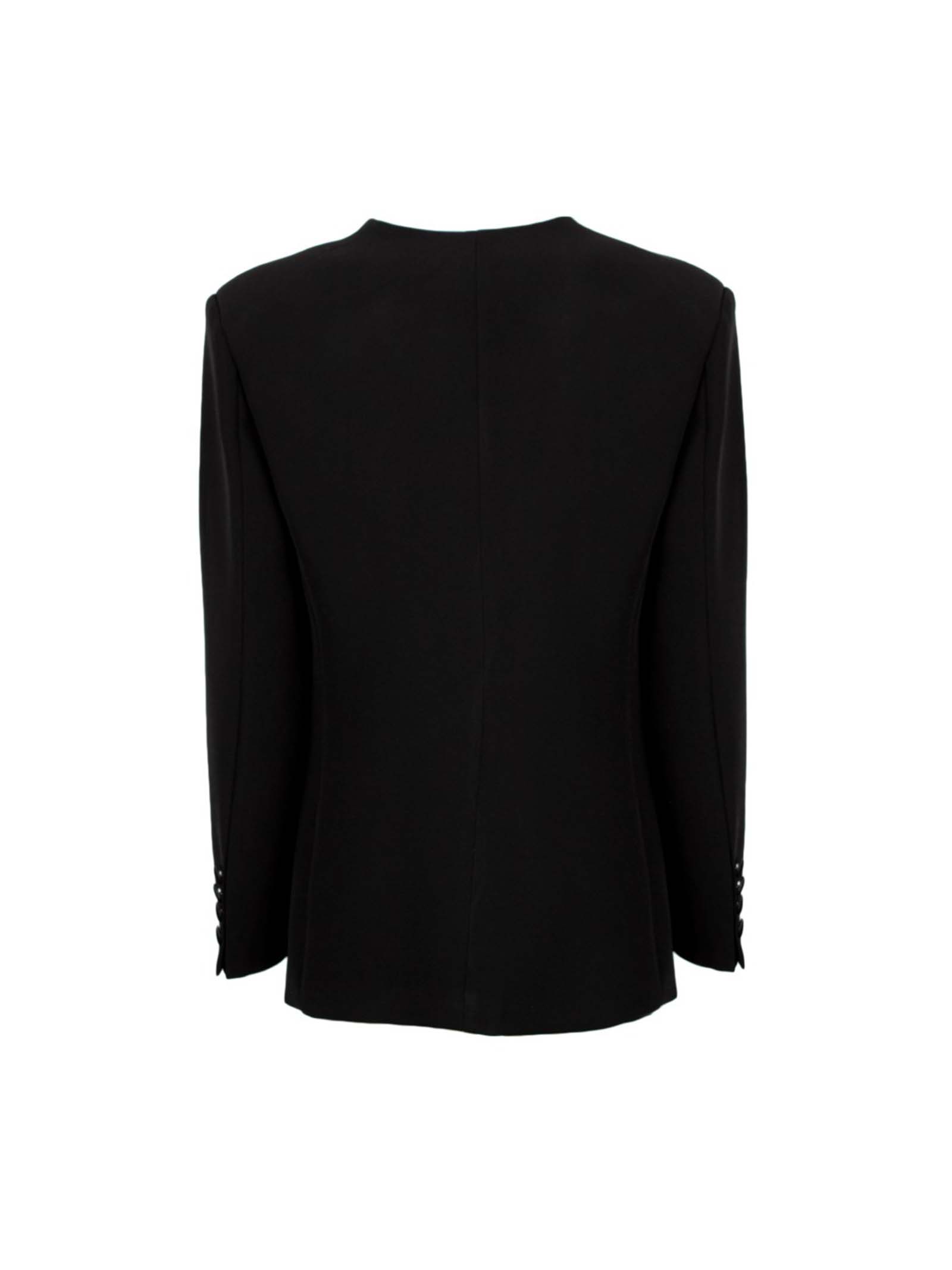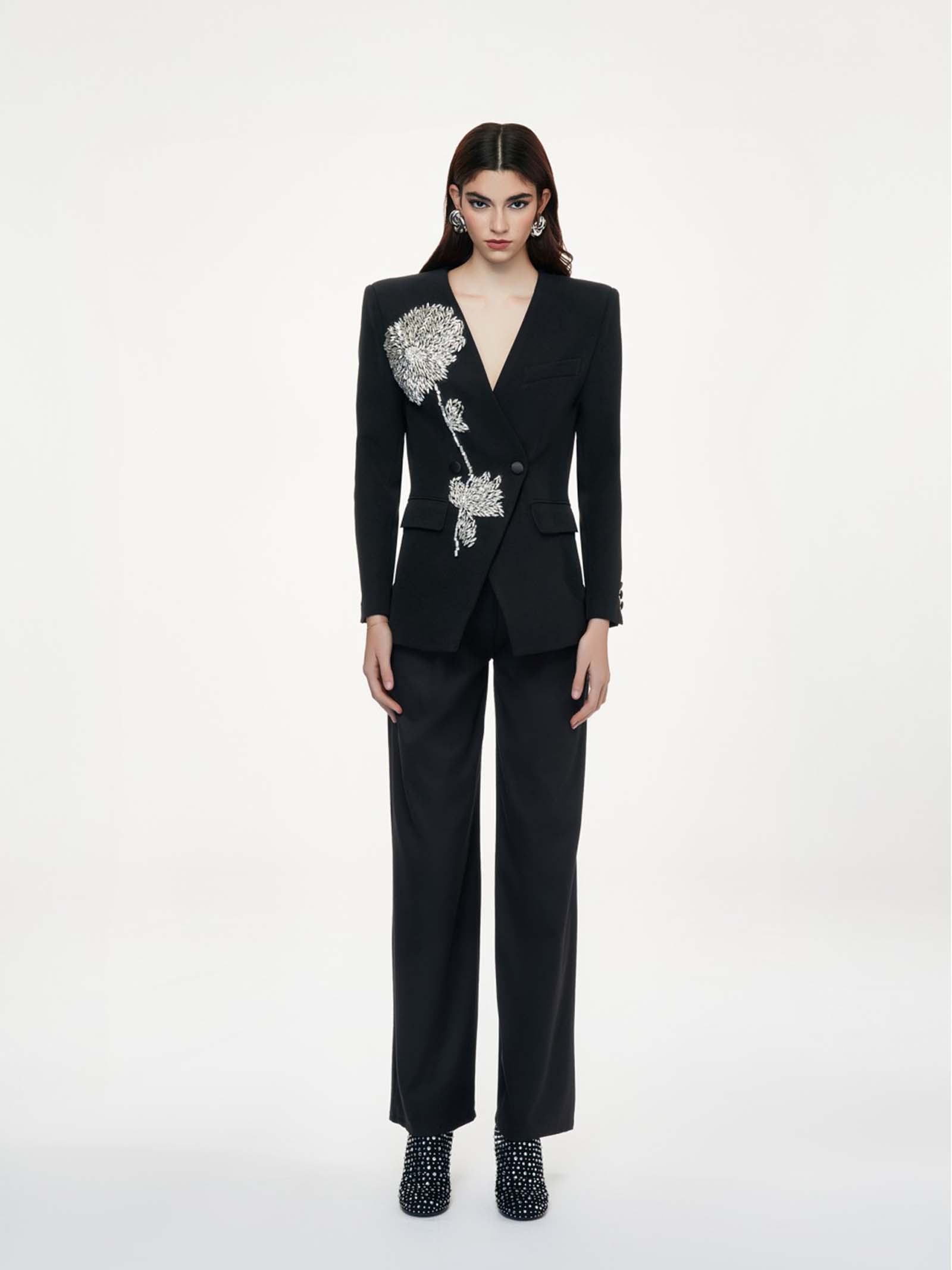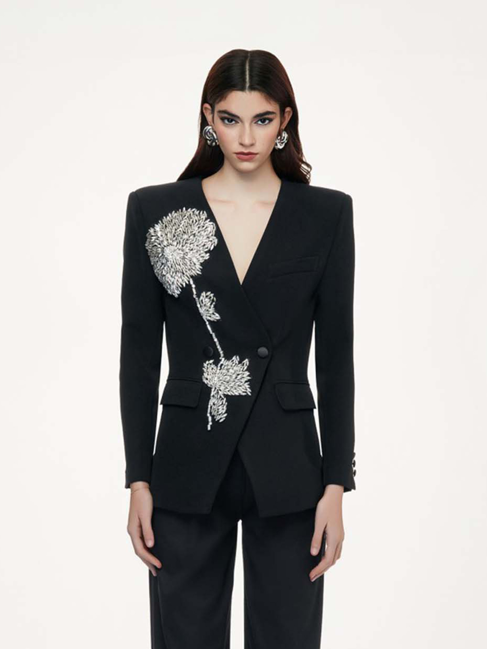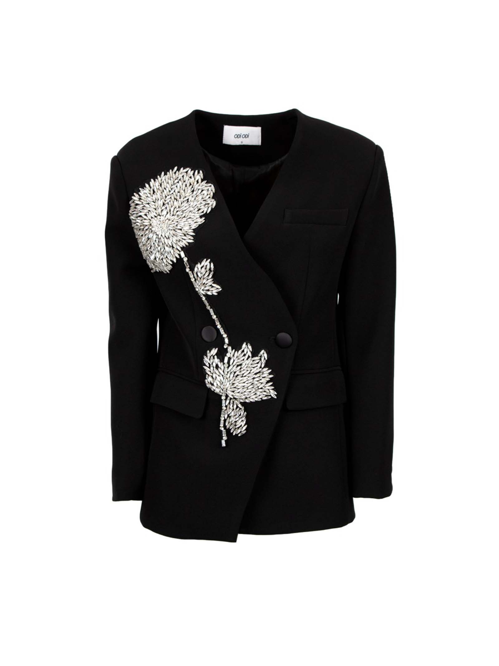 Giacca odi odi monopetto con taglio asimmetrico e scollo a V profondo. Chiusura a due bottoni coperti, applicazione floreale a rilievo sul davanti, realizzata con cristalli, tasche frontali a filetto.